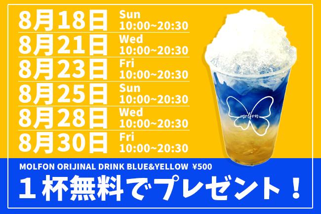 ポップアップショップのオープンを記念したイベントでは、対象日に来場した全員に通常価格500円の「MOLFON ORIJINAL DRINK BLUE&YELLOW」が1杯無料で提供されます。